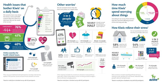 Recently, New Zealand rehabilitation service Active+ got thinking about what us Kiwis worry about. They conducted a survey to find out what make us tick. To be honest the results surprised us so much that we wanted to talk about it. Especially as so much of what people said relate to health, life changes and worry about the future.